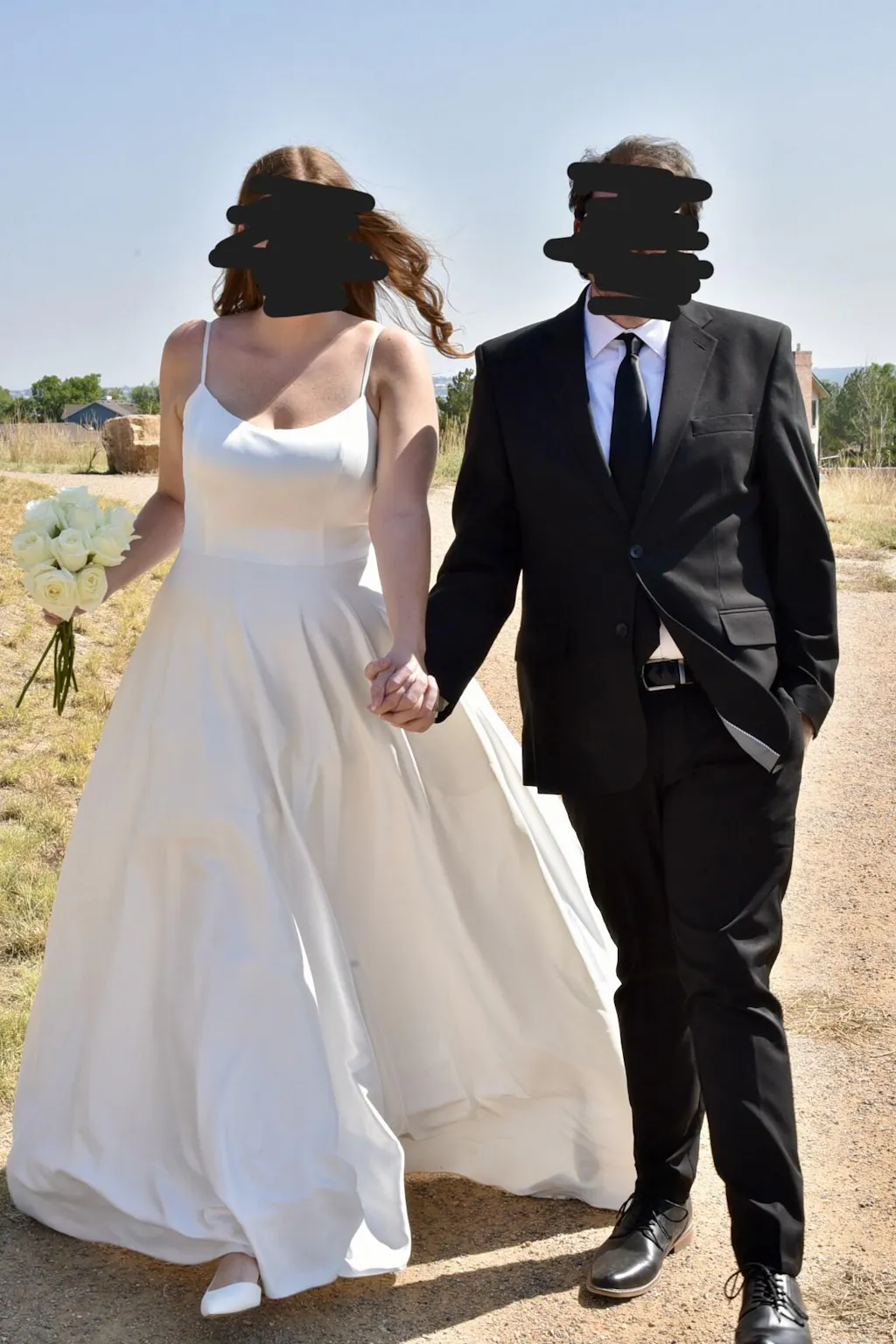 Chic and simple, the Giselle wedding dress has an air of beautiful elegance. The figure-flattering silhouette of this a-line wedding dress features a snug scoop-neck bodice and flowy skirt that ends in a long train. Dainty spaghetti straps round the shoulders and frame the open back of this satin wedding dress. Pockets and fabric covered buttons add just the right amount of modern style to the classic design. Available in black or ivory, this simple wedding dress is a gorgeous fashion suited to a variety of wedding themes.