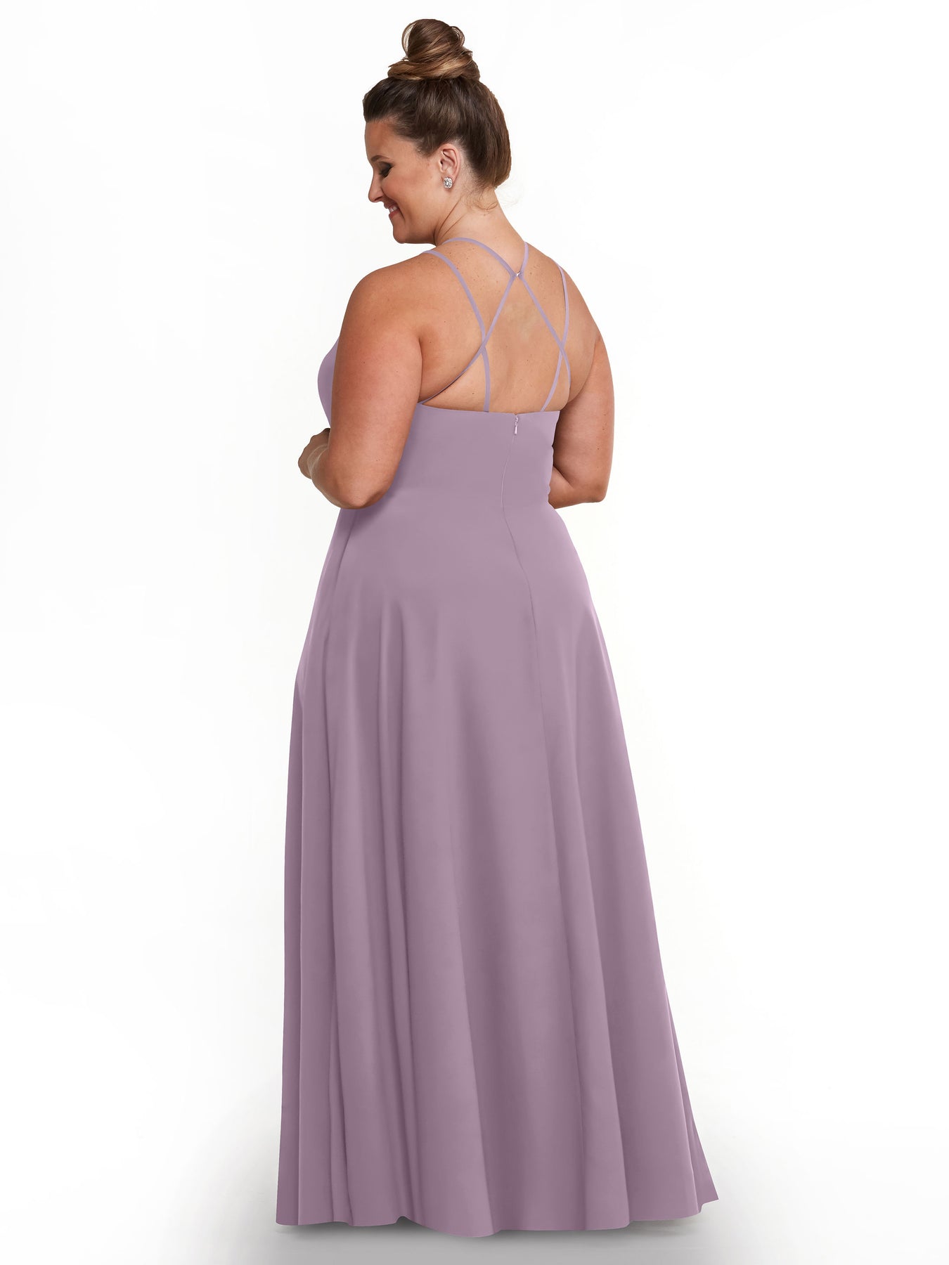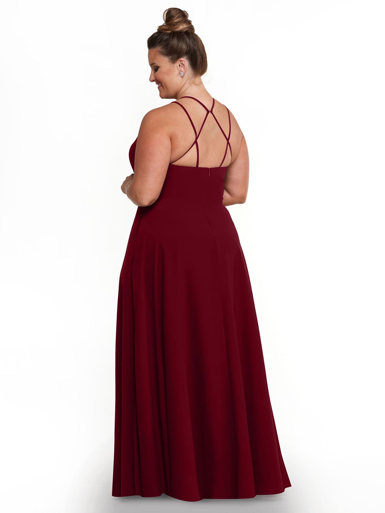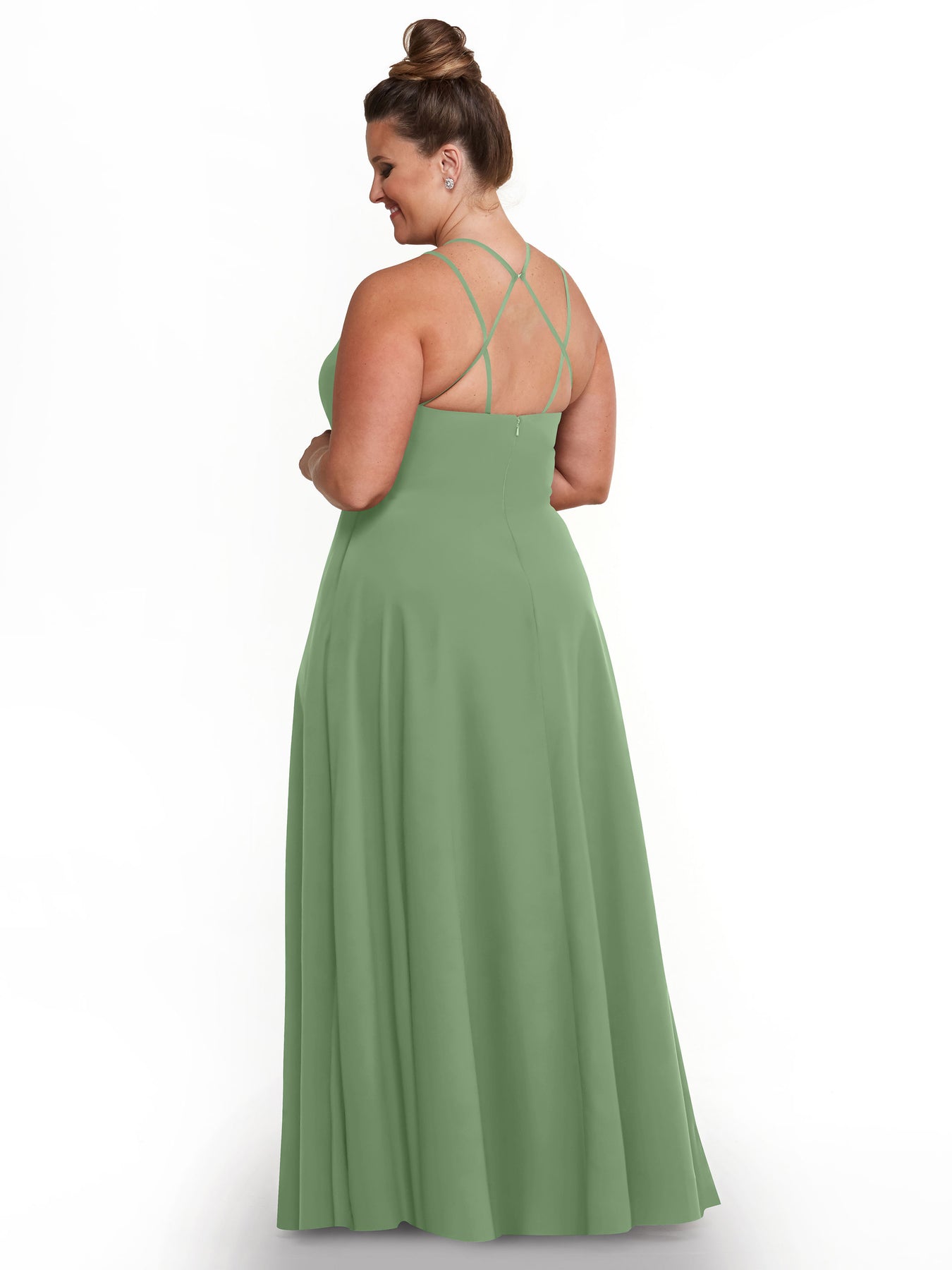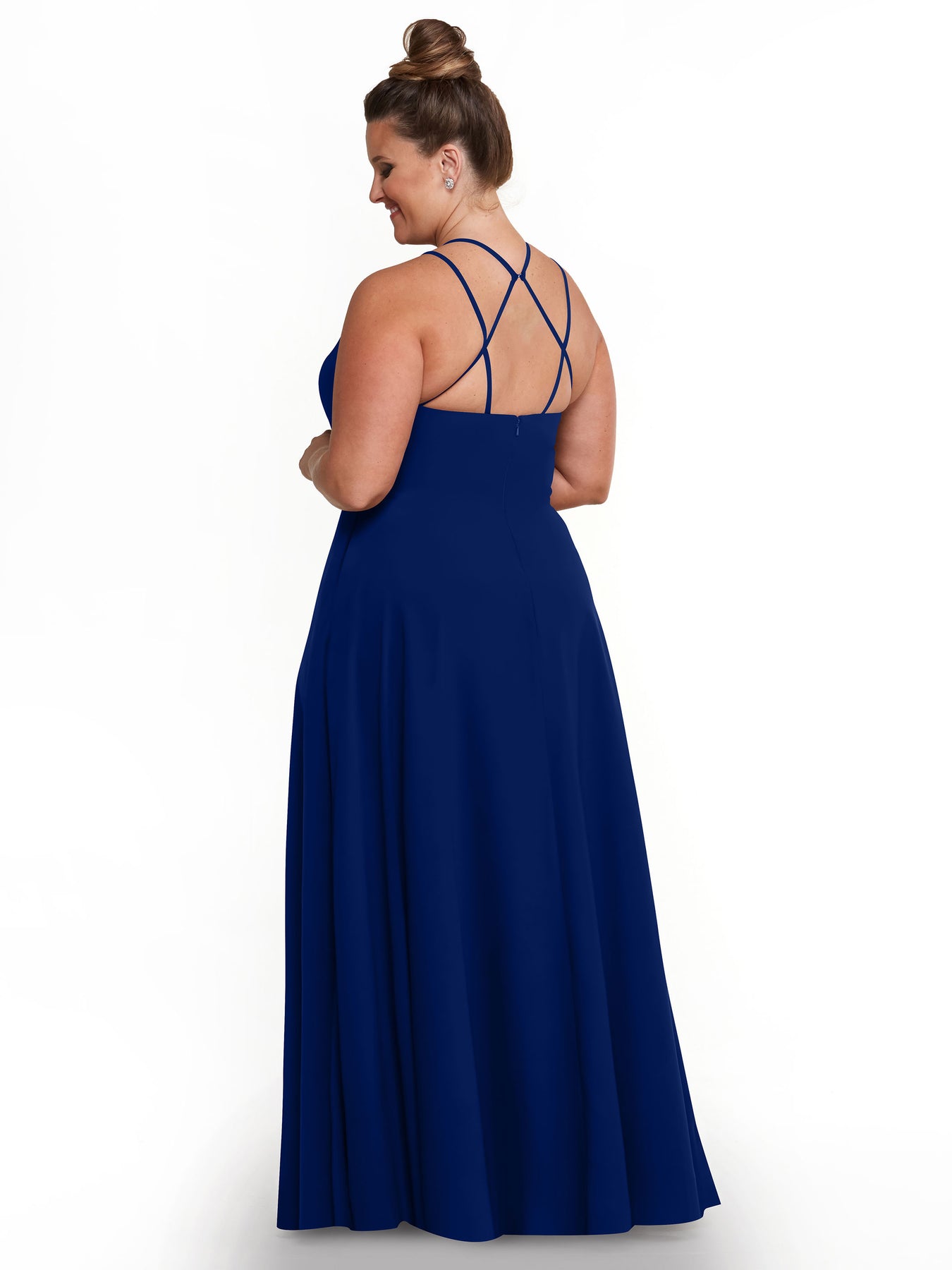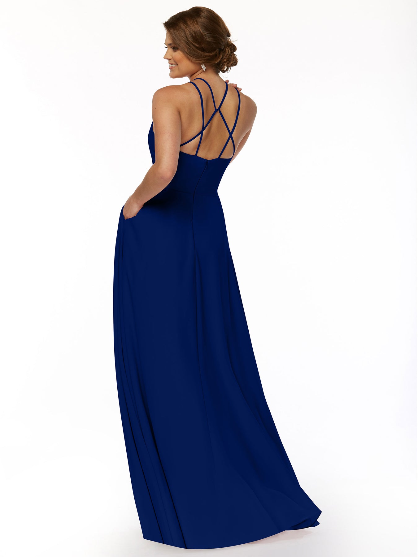 This A-Line dress features a halter neckline, with intricate straps that cross on the back.