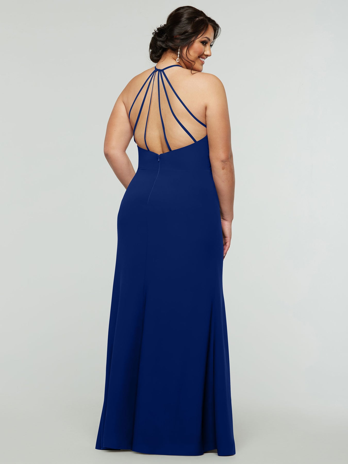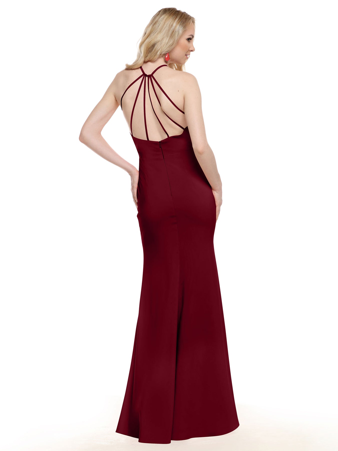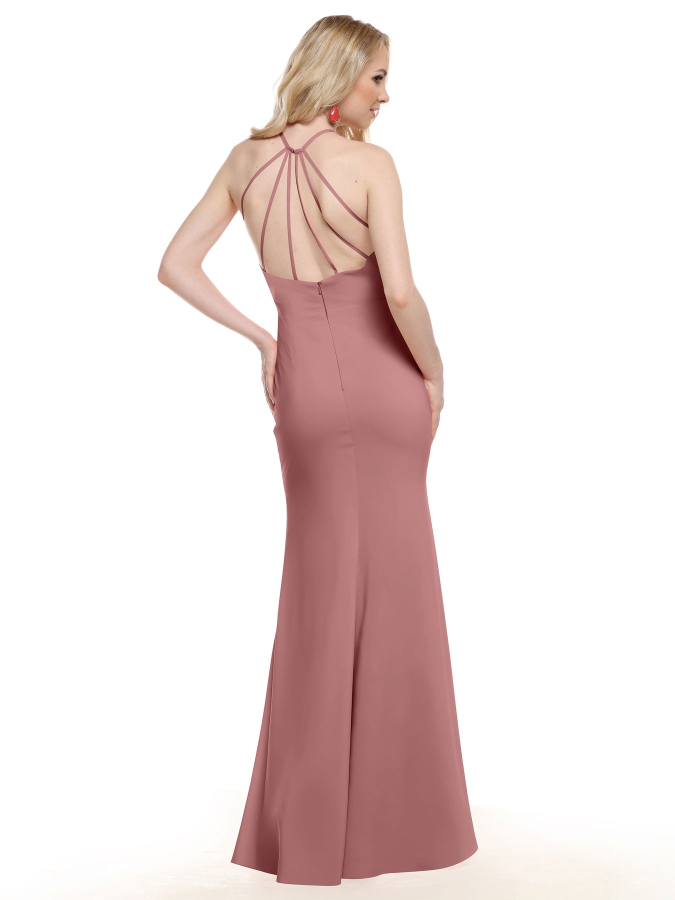 This fitted halter dress features a slit on the side and an intricate strapped back.