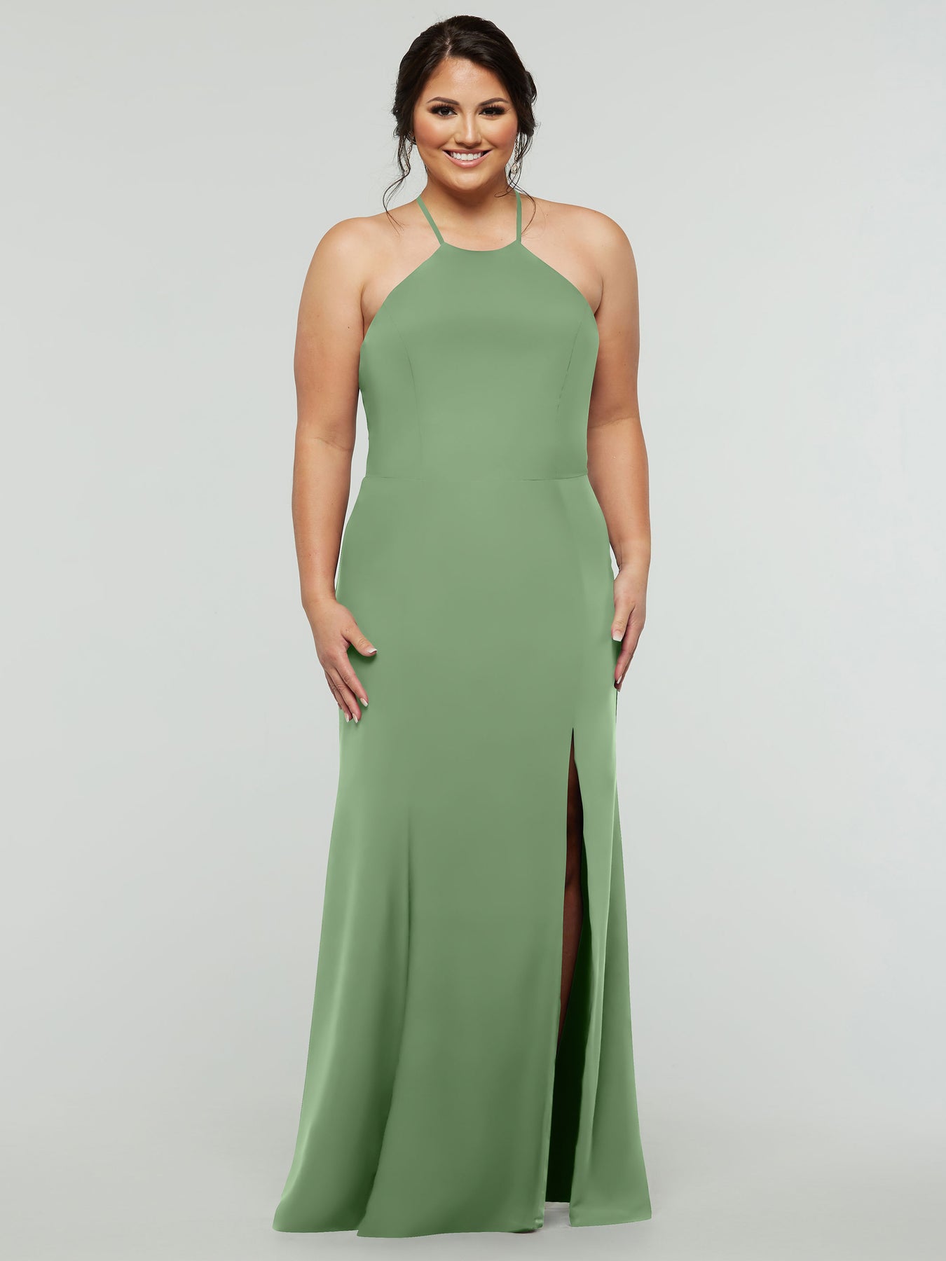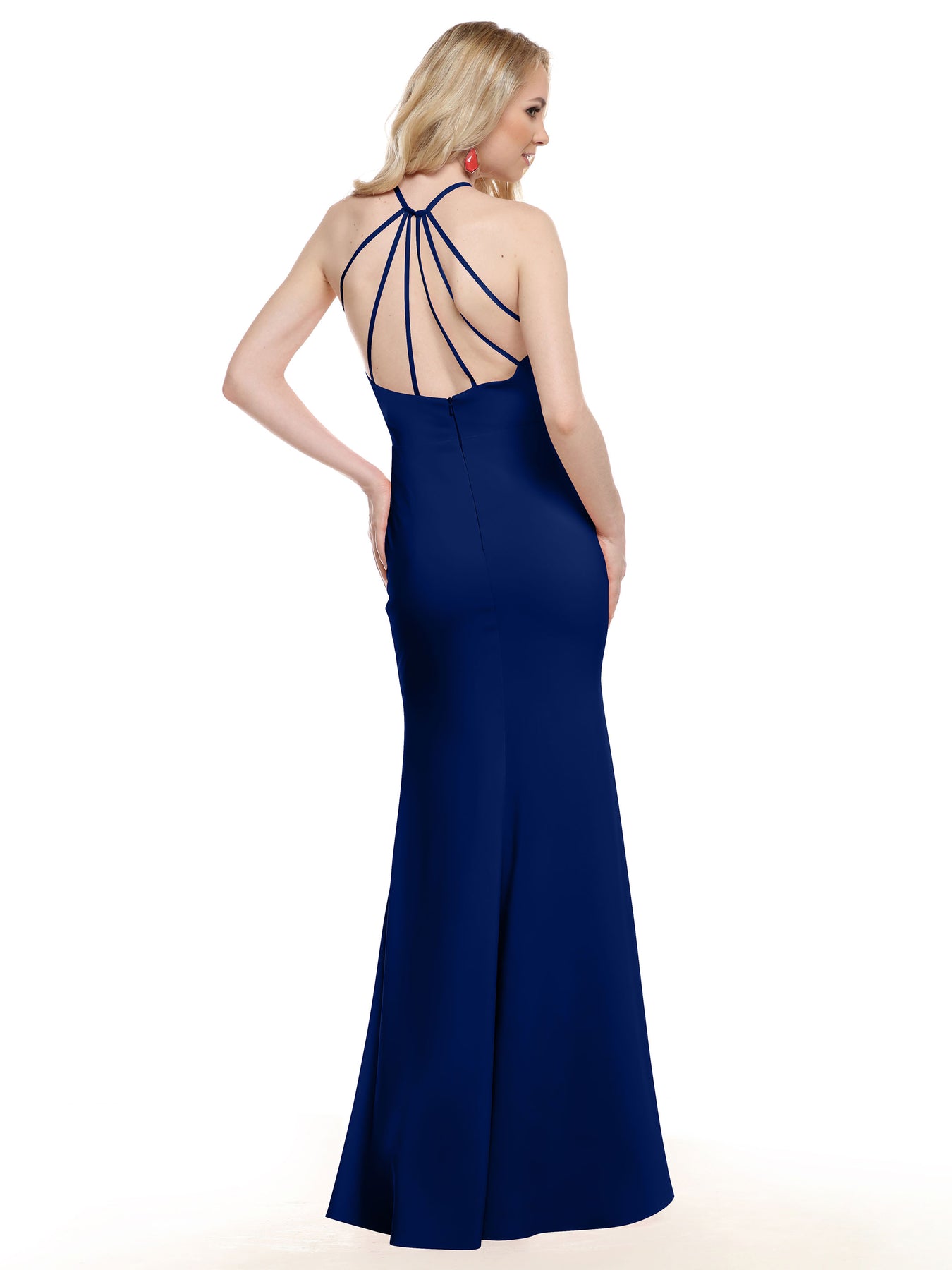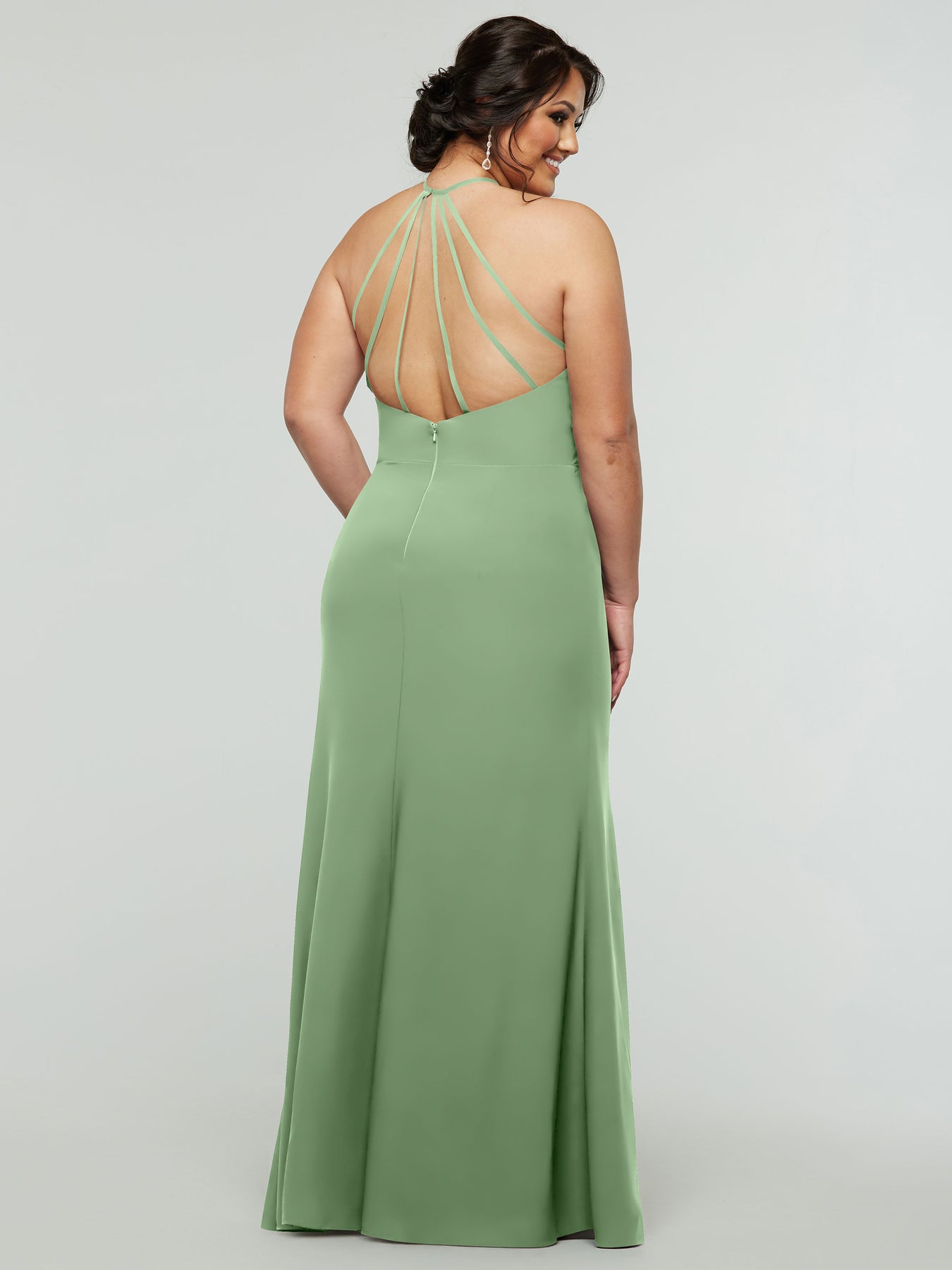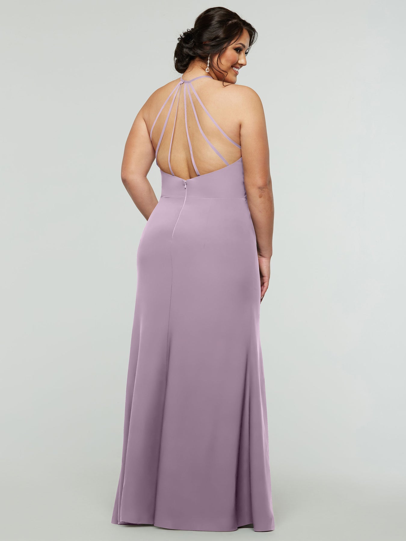 This fitted halter dress features a slit on the side and an intricate strapped back.