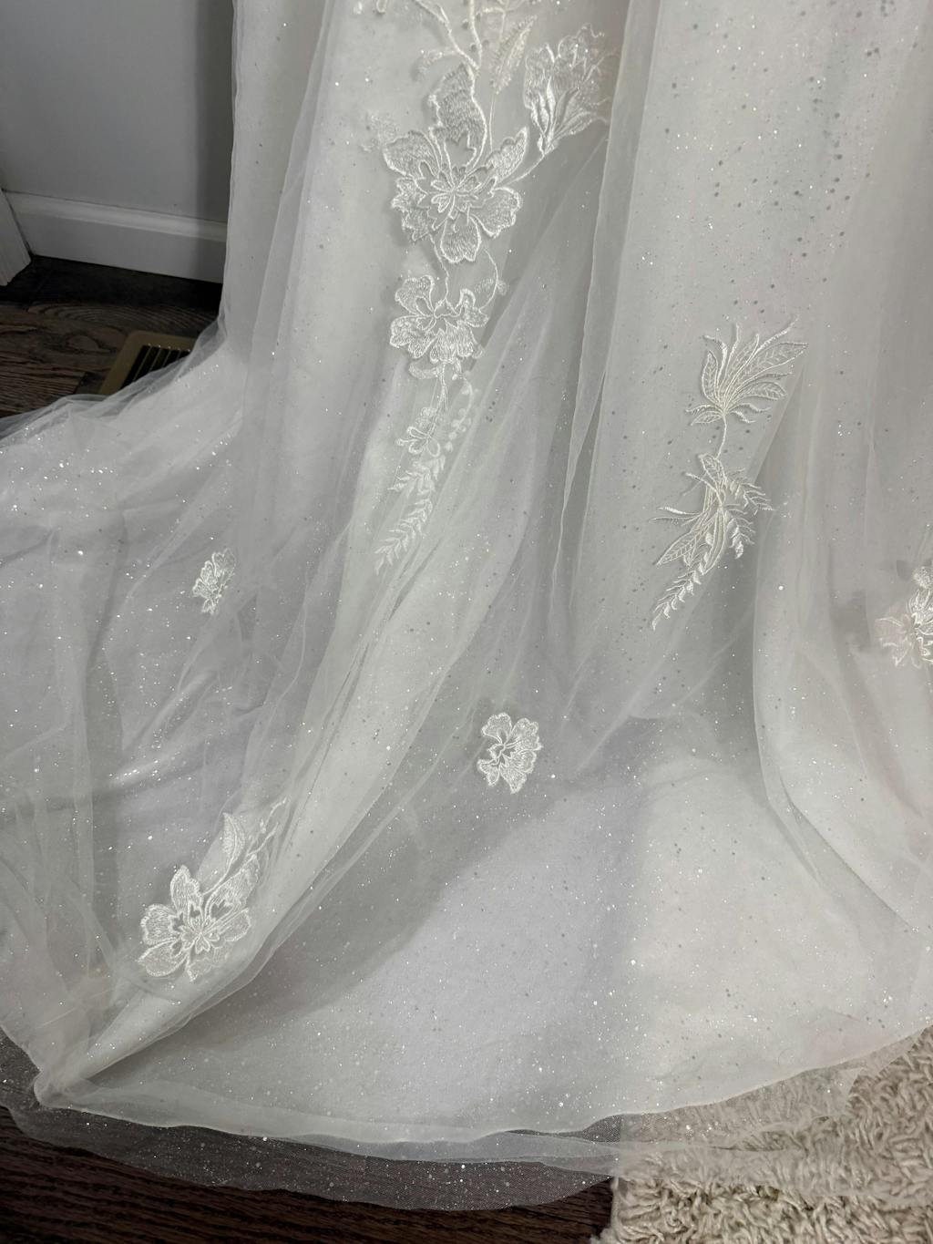 This dress came without the off shoulder sleeves, which was what I was hoping to try on. The dress was very pretty and sparkly. The glitter tulle on the skirt was an eye catcher. The illusion bodice was beautiful. The slit in the skirt was a fun detail.