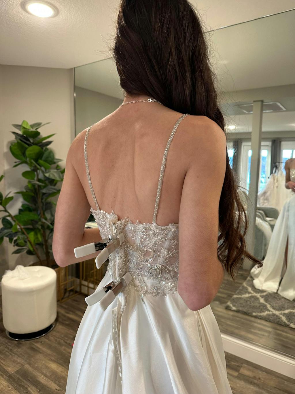 This dress is prettier in person than the pictures online show. A close up of this bodice would be helpful to show how sparkly and stunning it is! The spaghetti straps add a little extra sparkle. The back has buttons and loops that cover the zipper. The skirt fabric is light and flowy and the long train is gorgeous! This dress is spectacular!!!
