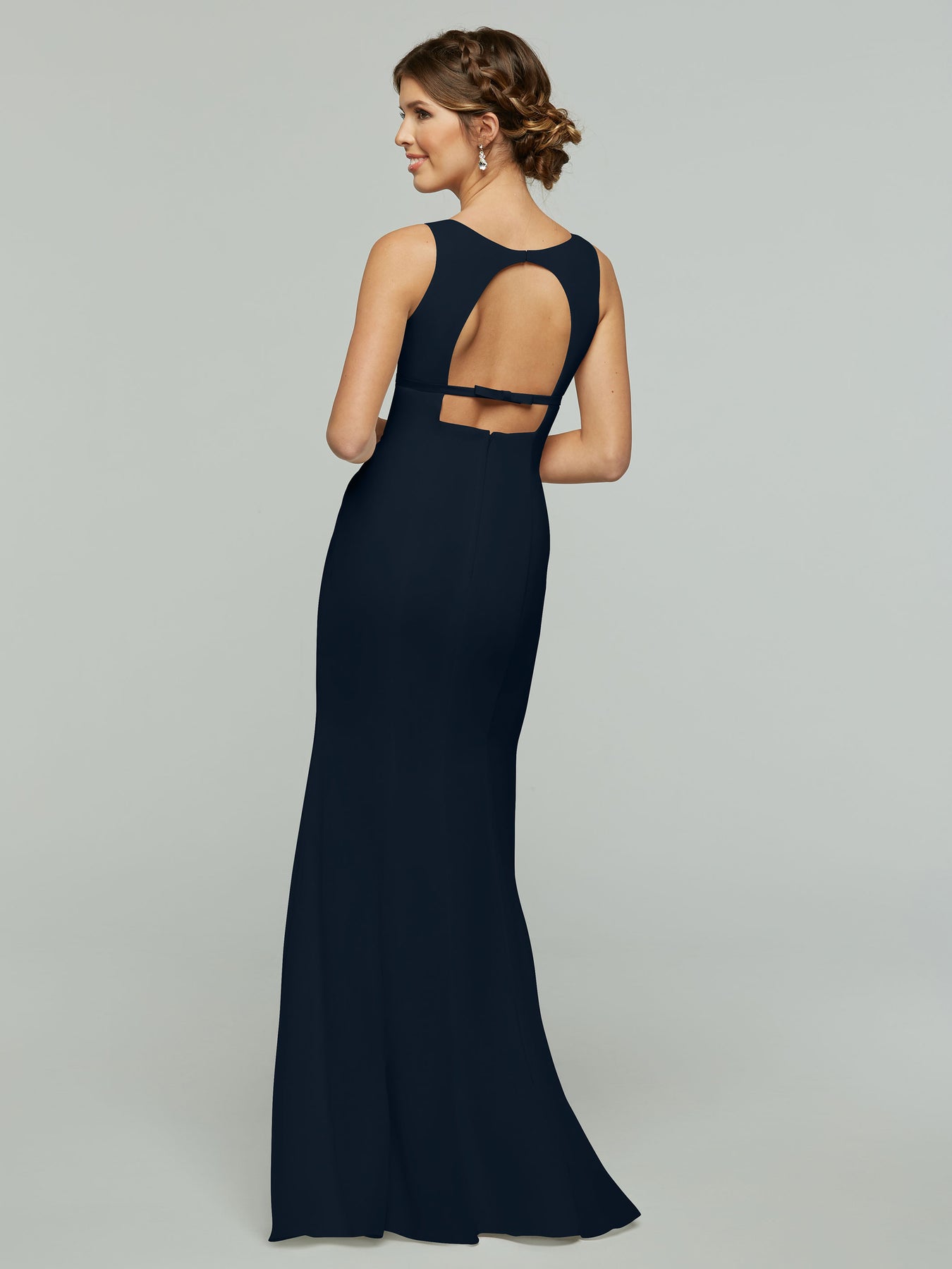 Fit and flare, chiffon dress with a satin ribbon that accents the bust. The ribbon connects in the back, in the middle of an open keyhole back.