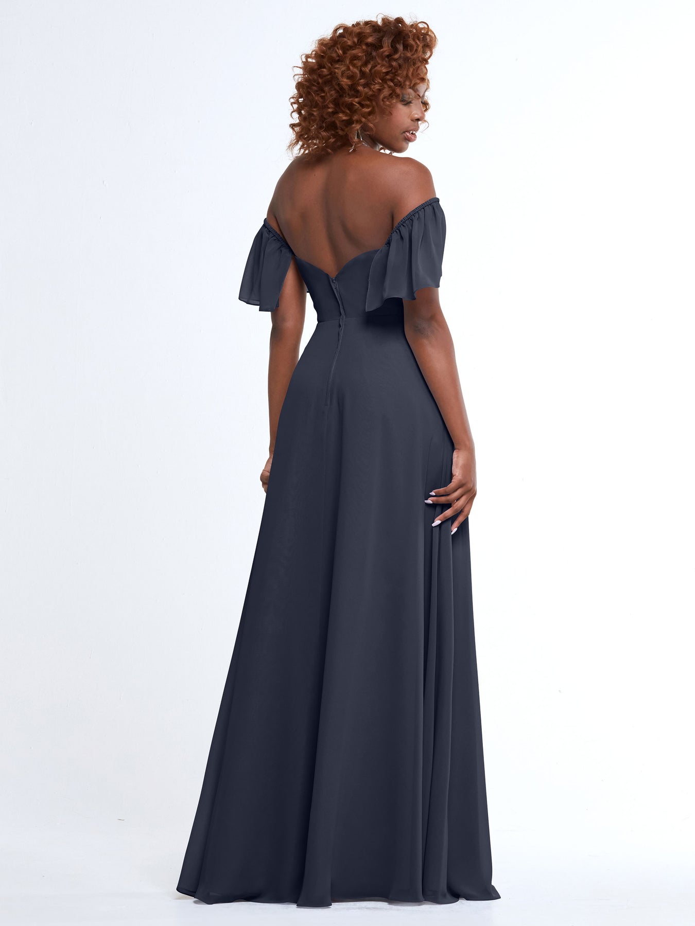 This flowy A-Line dress features matching chiffon off-the-shoulder straps and pockets in the skirt.