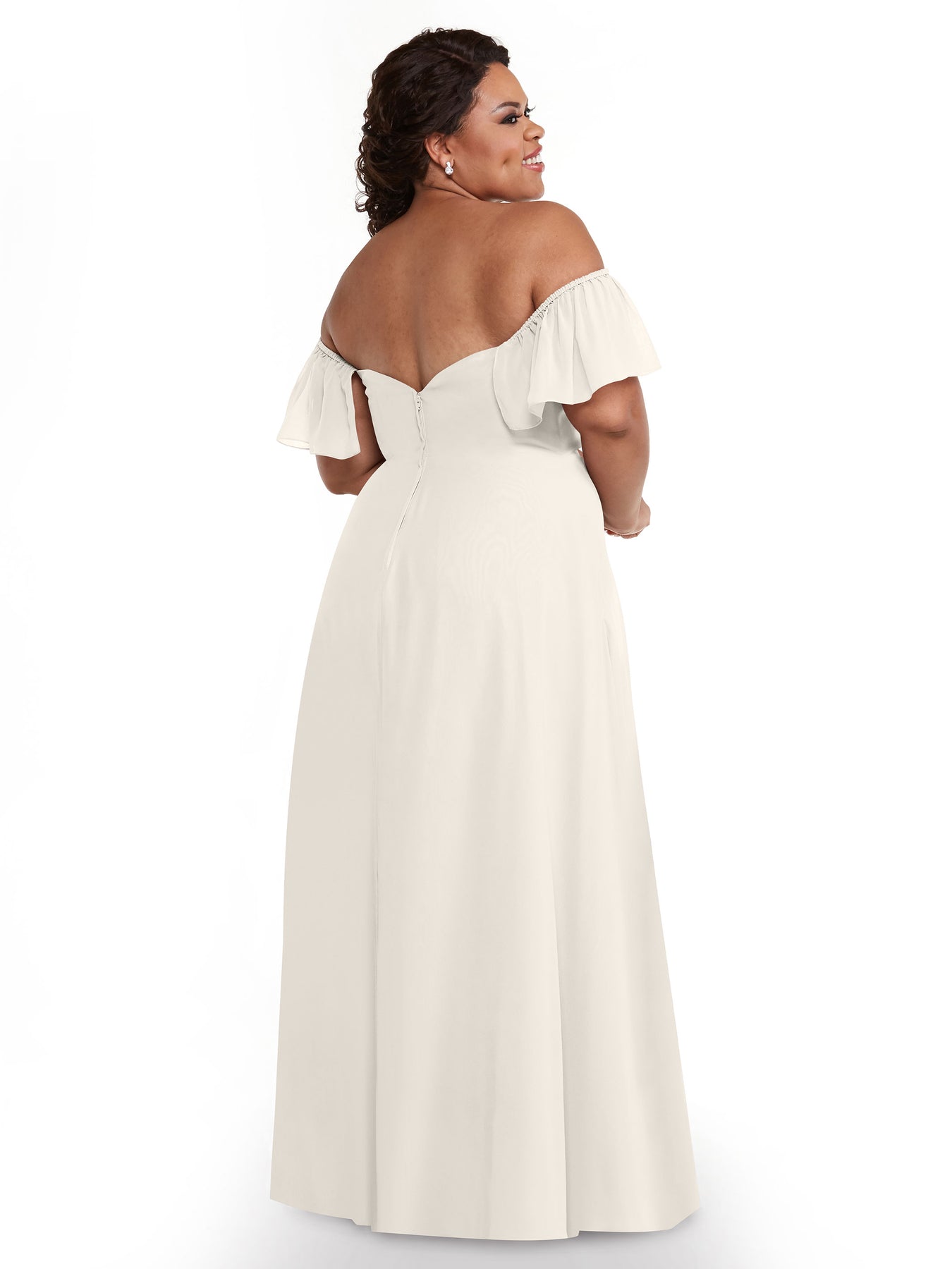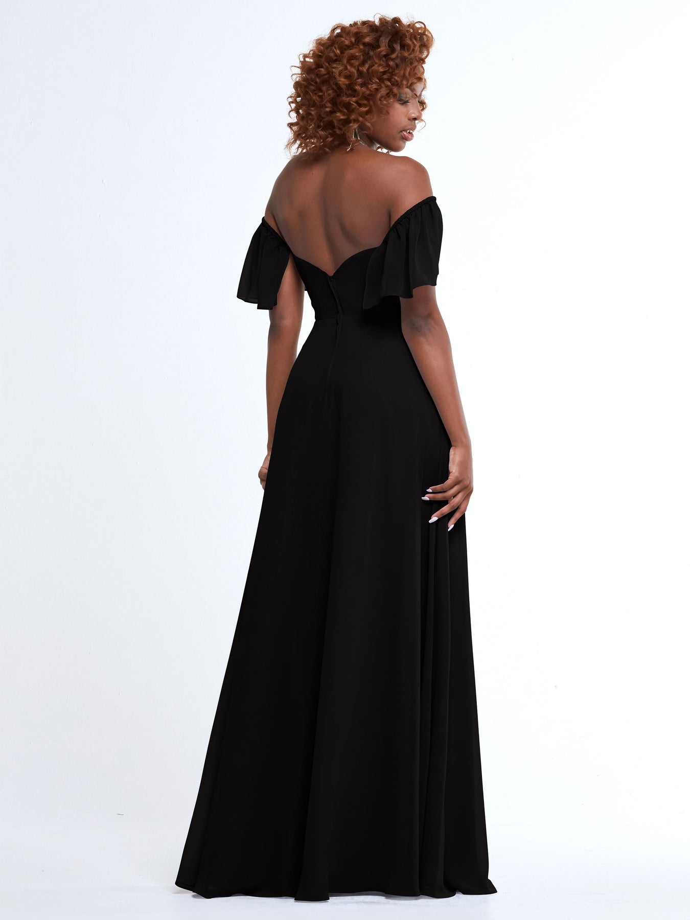 This flowy A-Line dress features matching chiffon off-the-shoulder straps and pockets in the skirt.