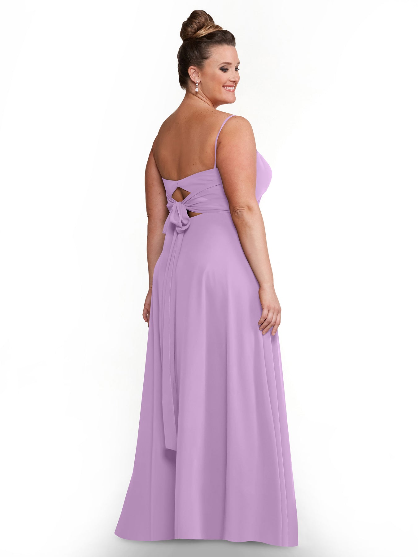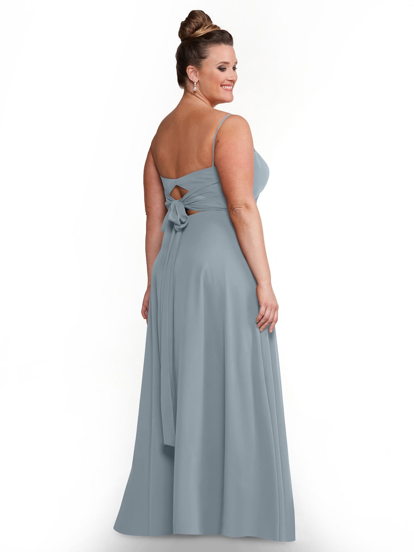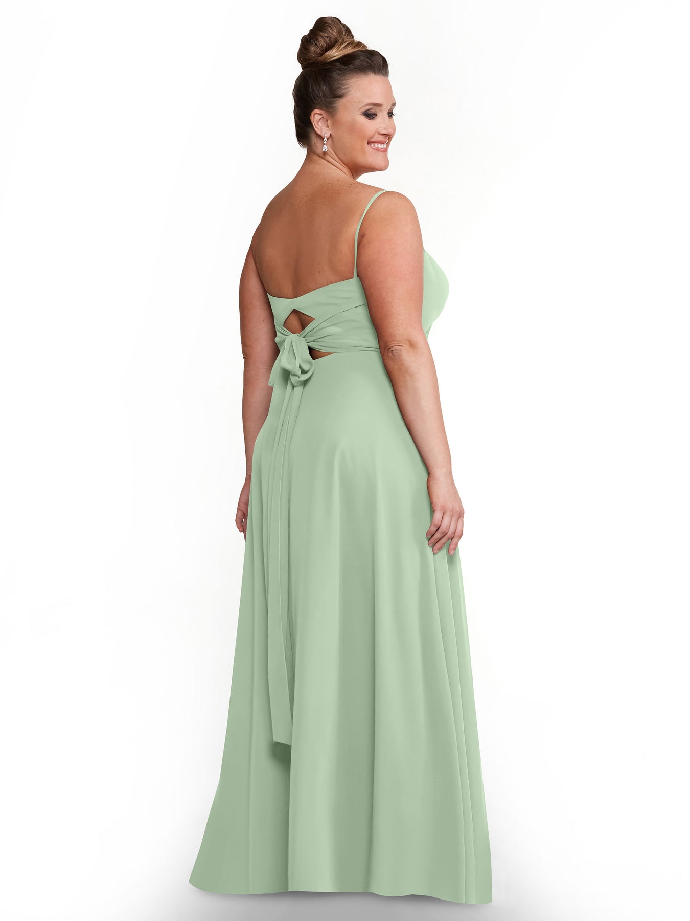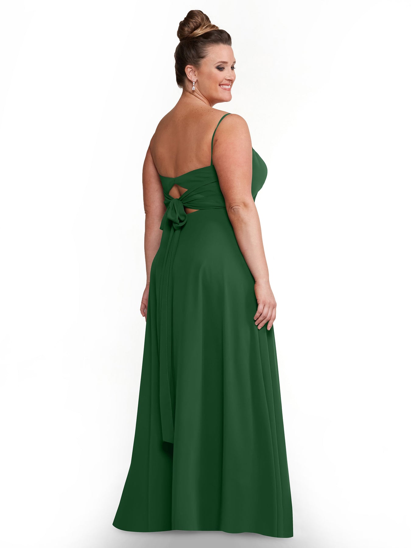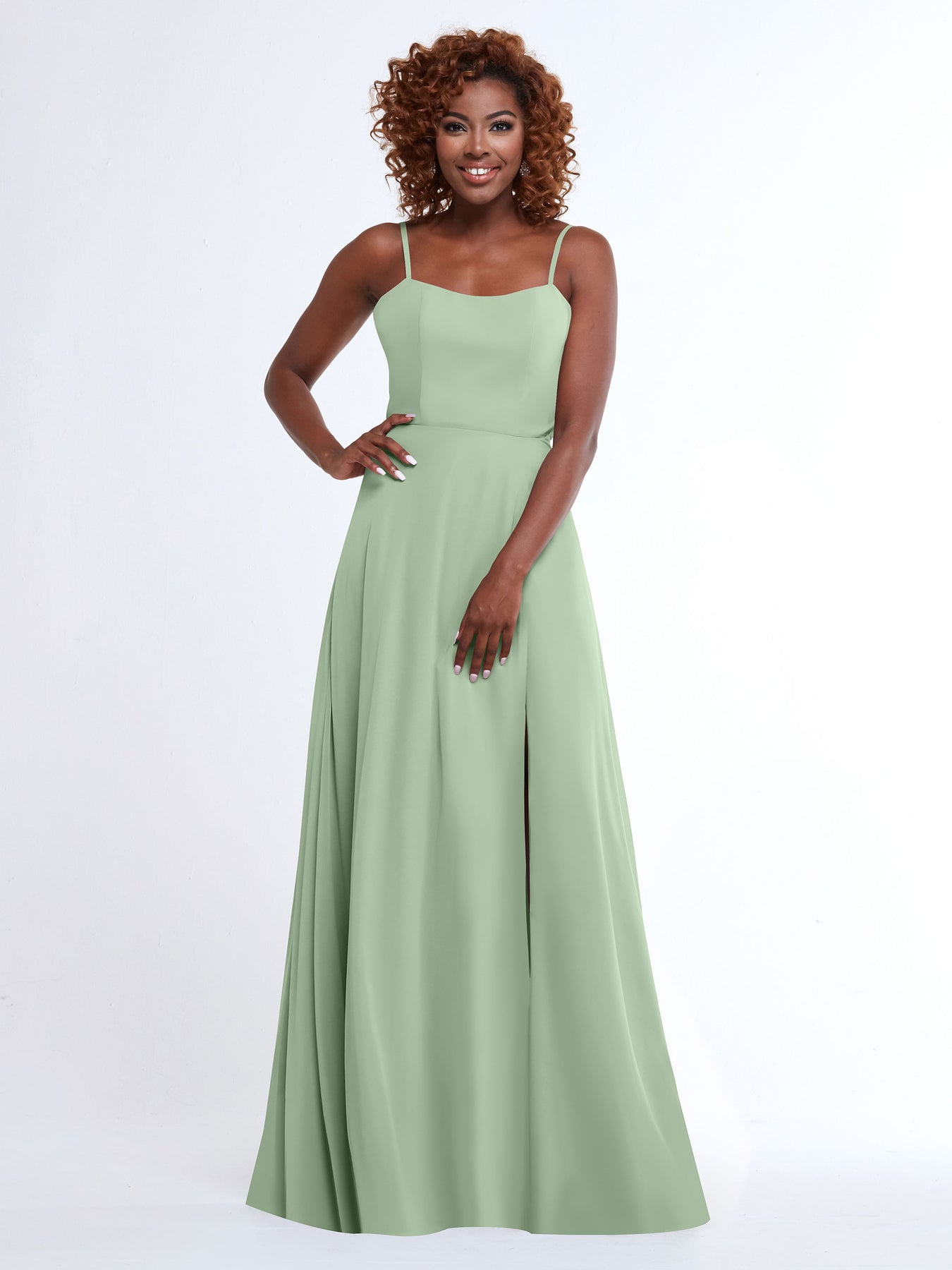 This flowy A-Line dress with spaghetti straps that leads to a complex back.
