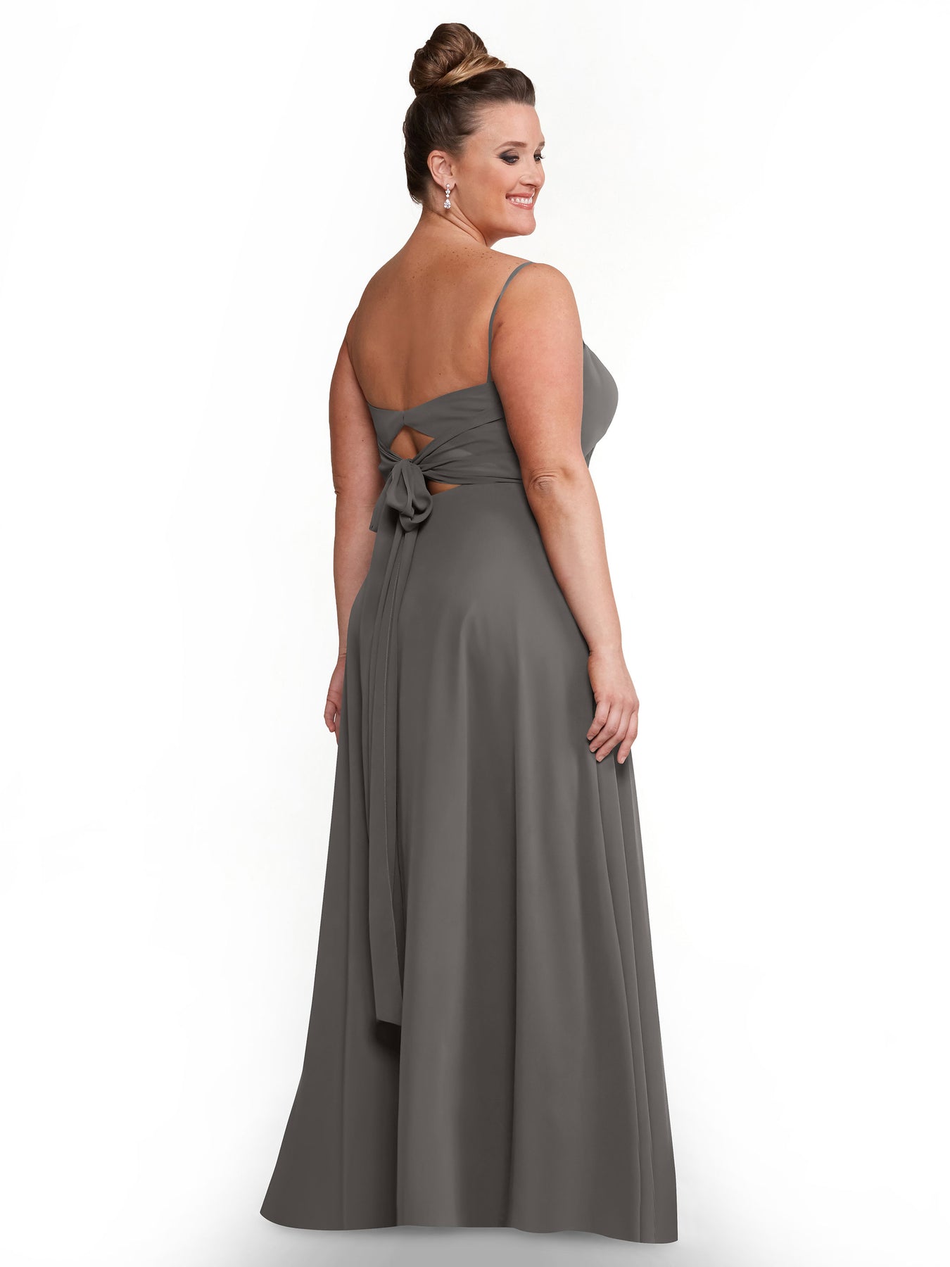 This flowy A-Line dress with spaghetti straps that leads to a complex back.