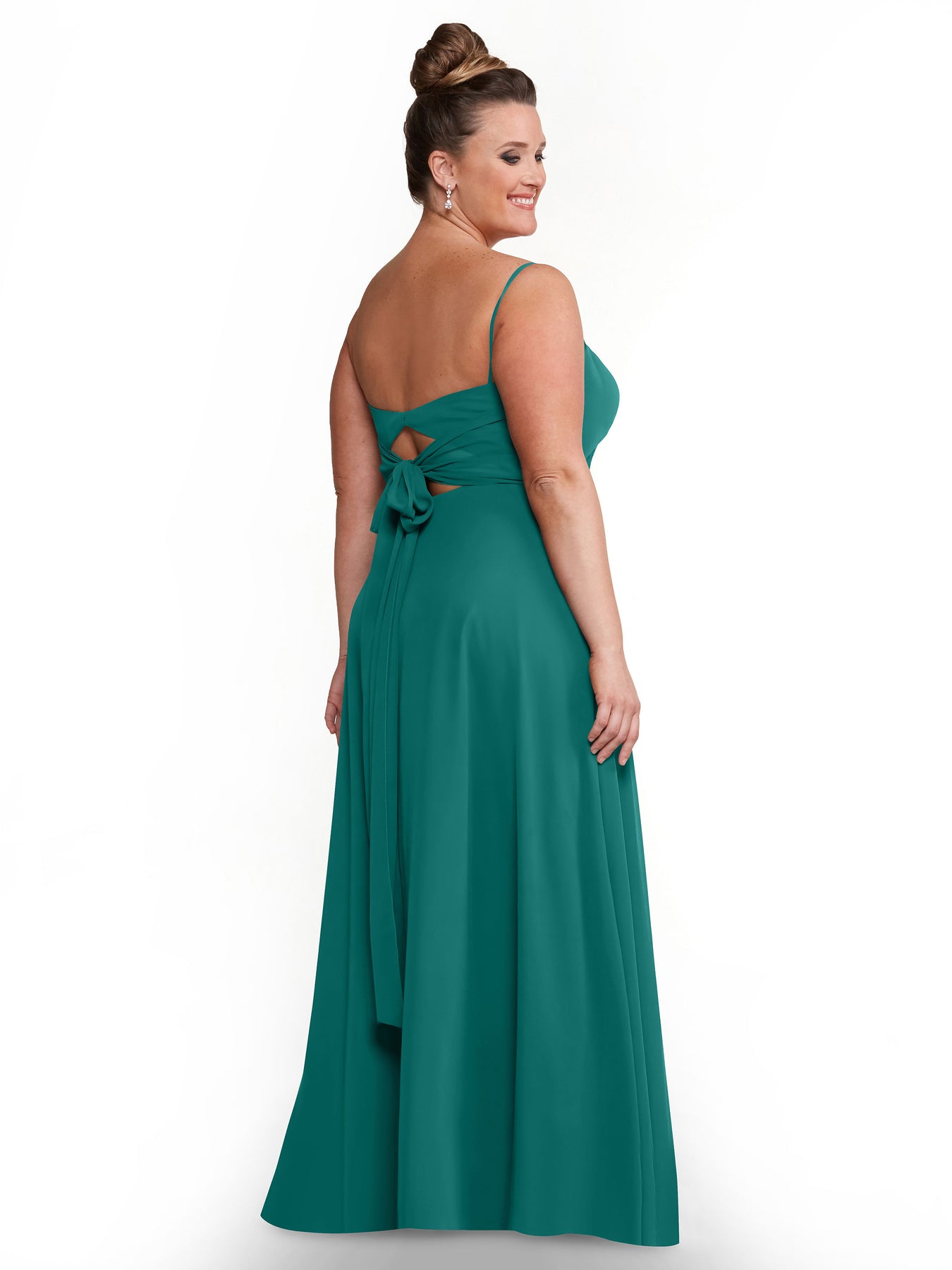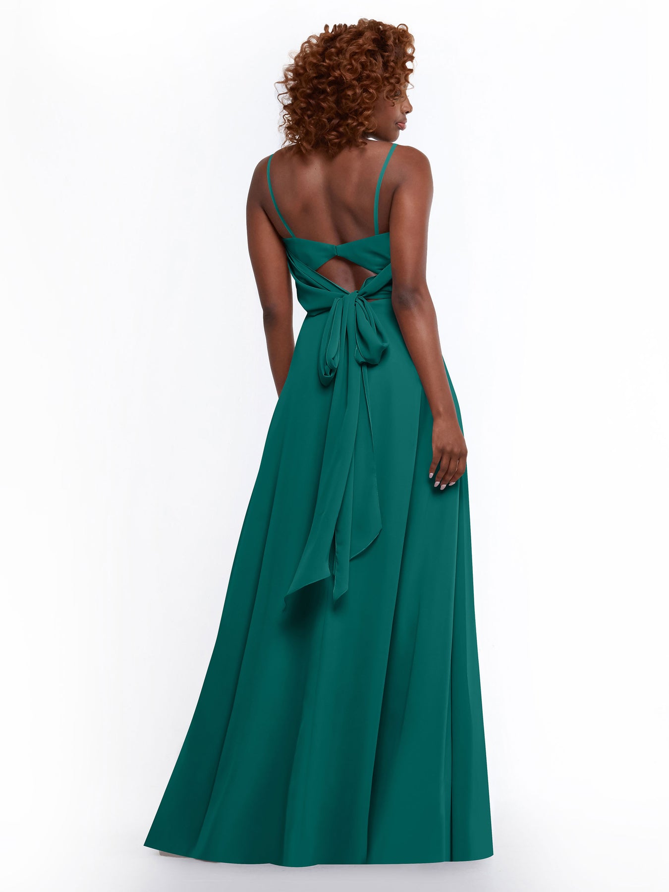 This flowy A-Line dress with spaghetti straps that leads to a complex back.
