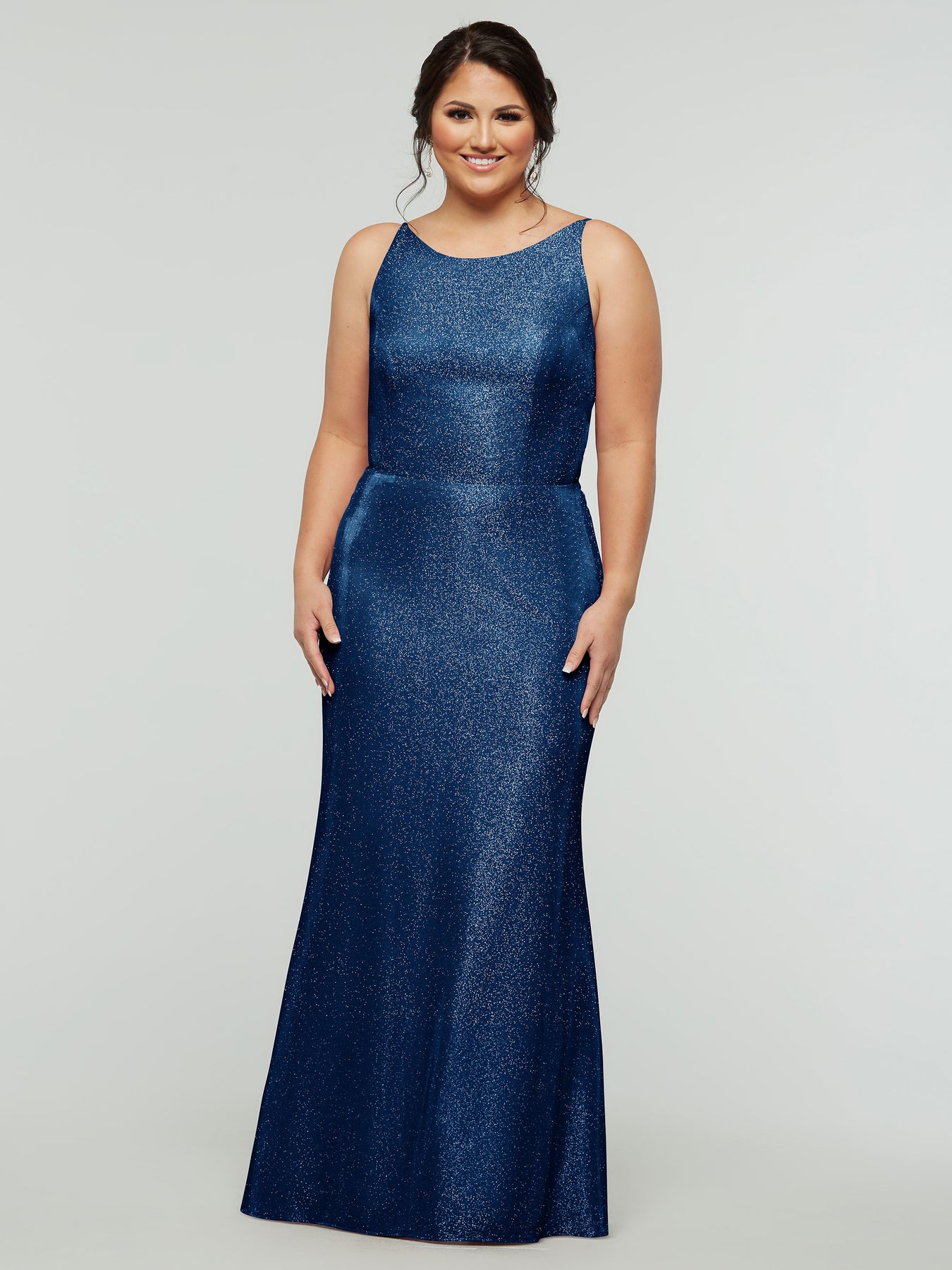 This fitted dress features a bateau neckline and a cowl back with glitter knit.