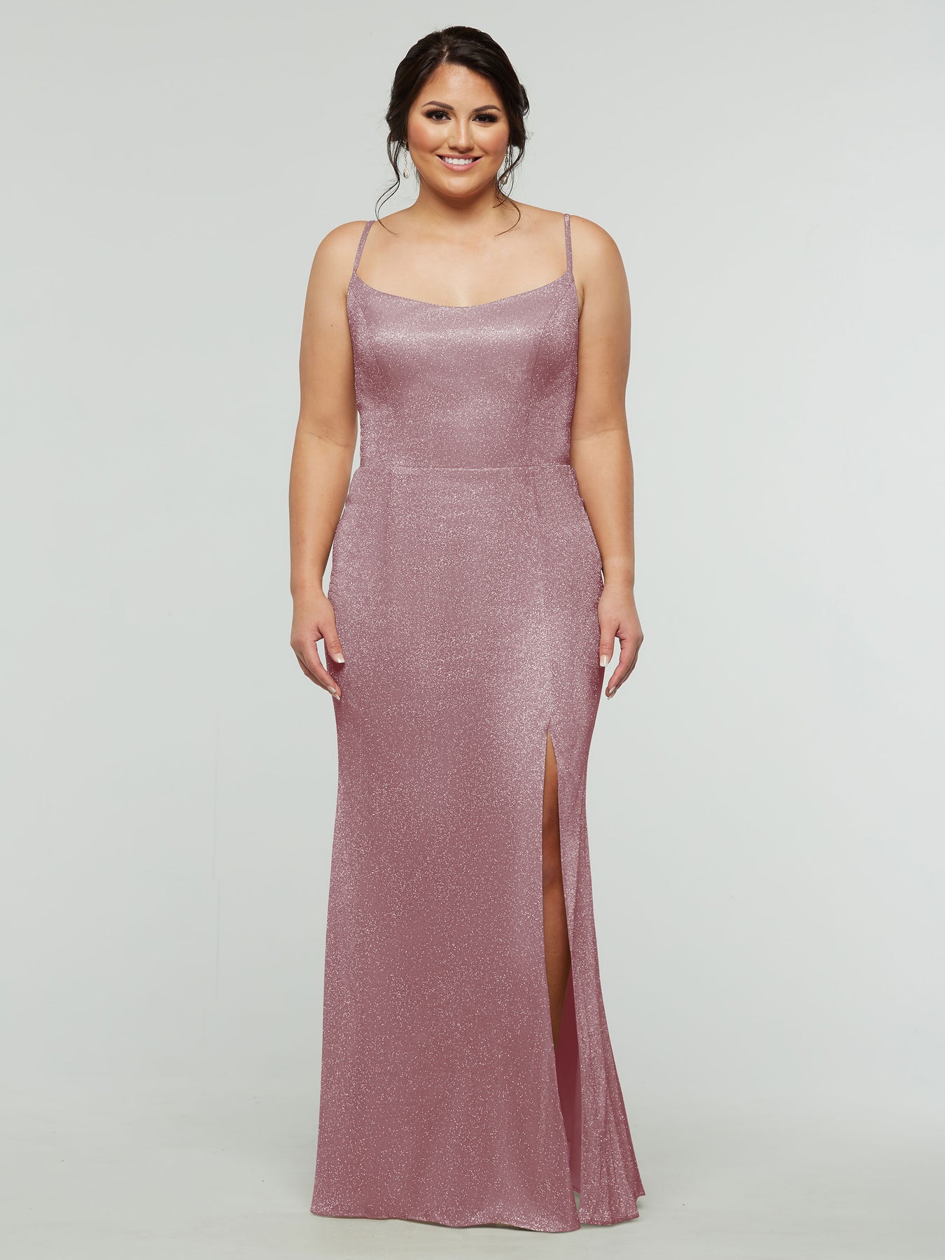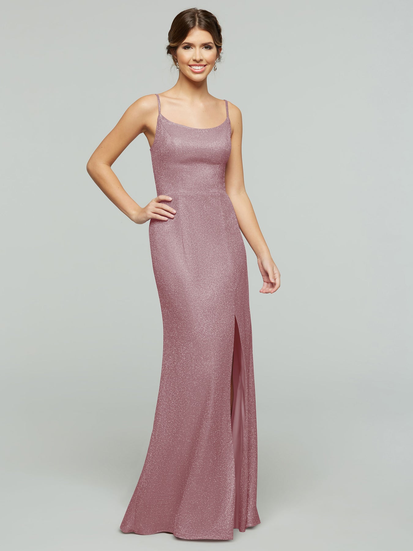This sheath dress features a slit on the side and intricate spaghetti straps.