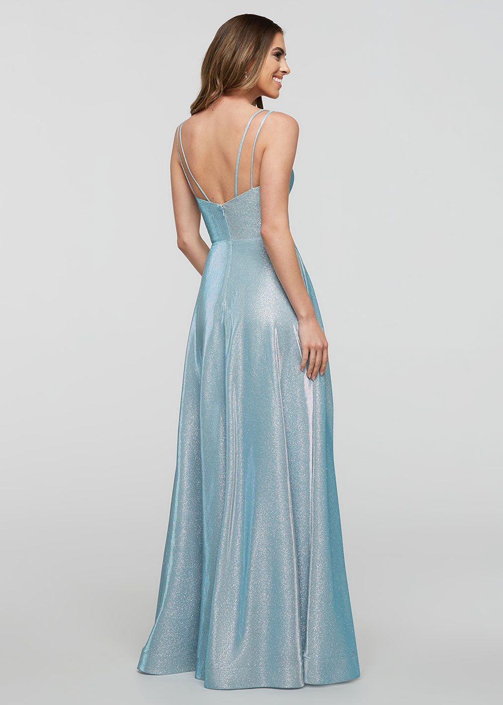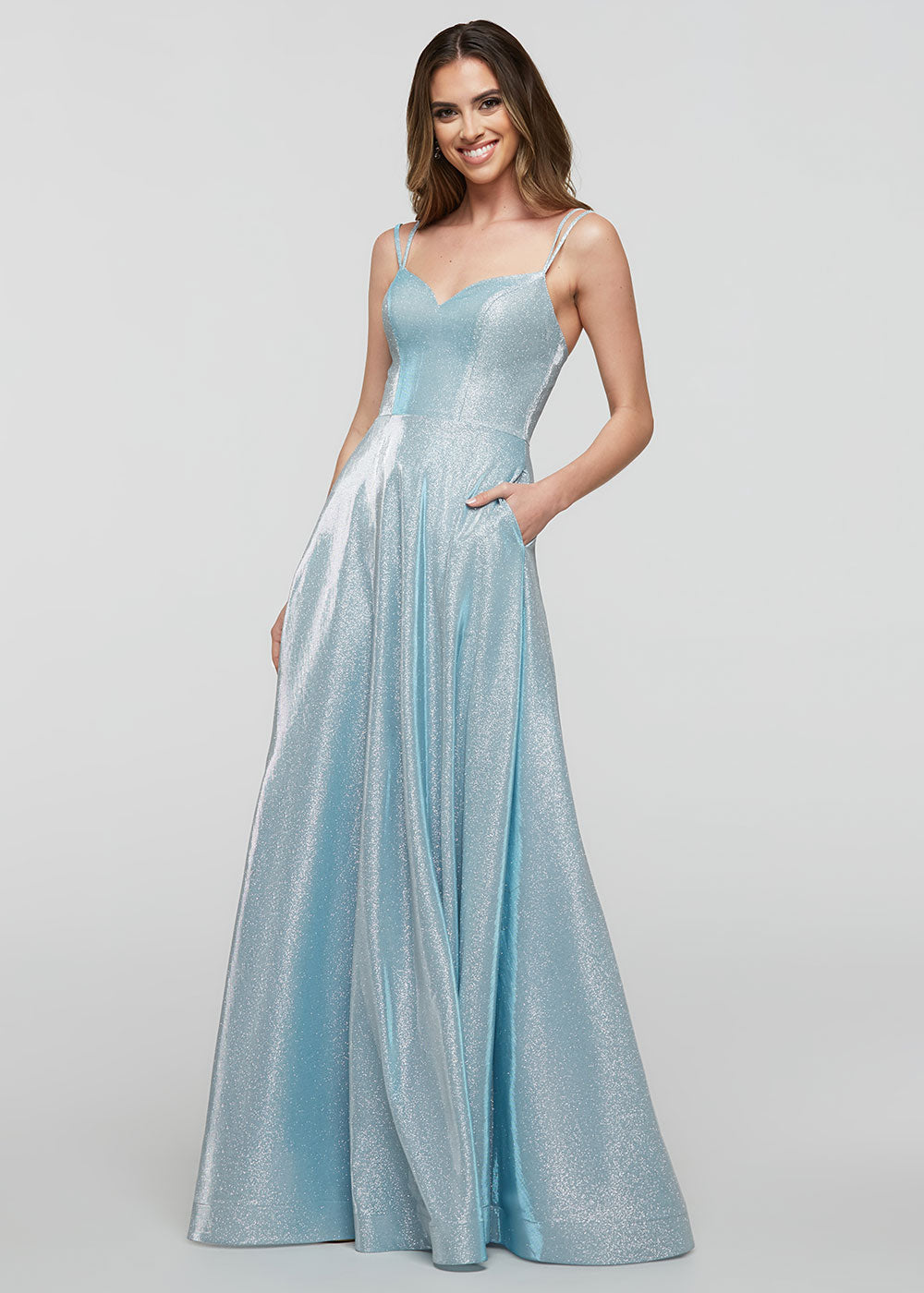 An elegant flowy A-Line gown featuring a sweetheart neckline, pockets, and double spaghetti straps that lead in to back .