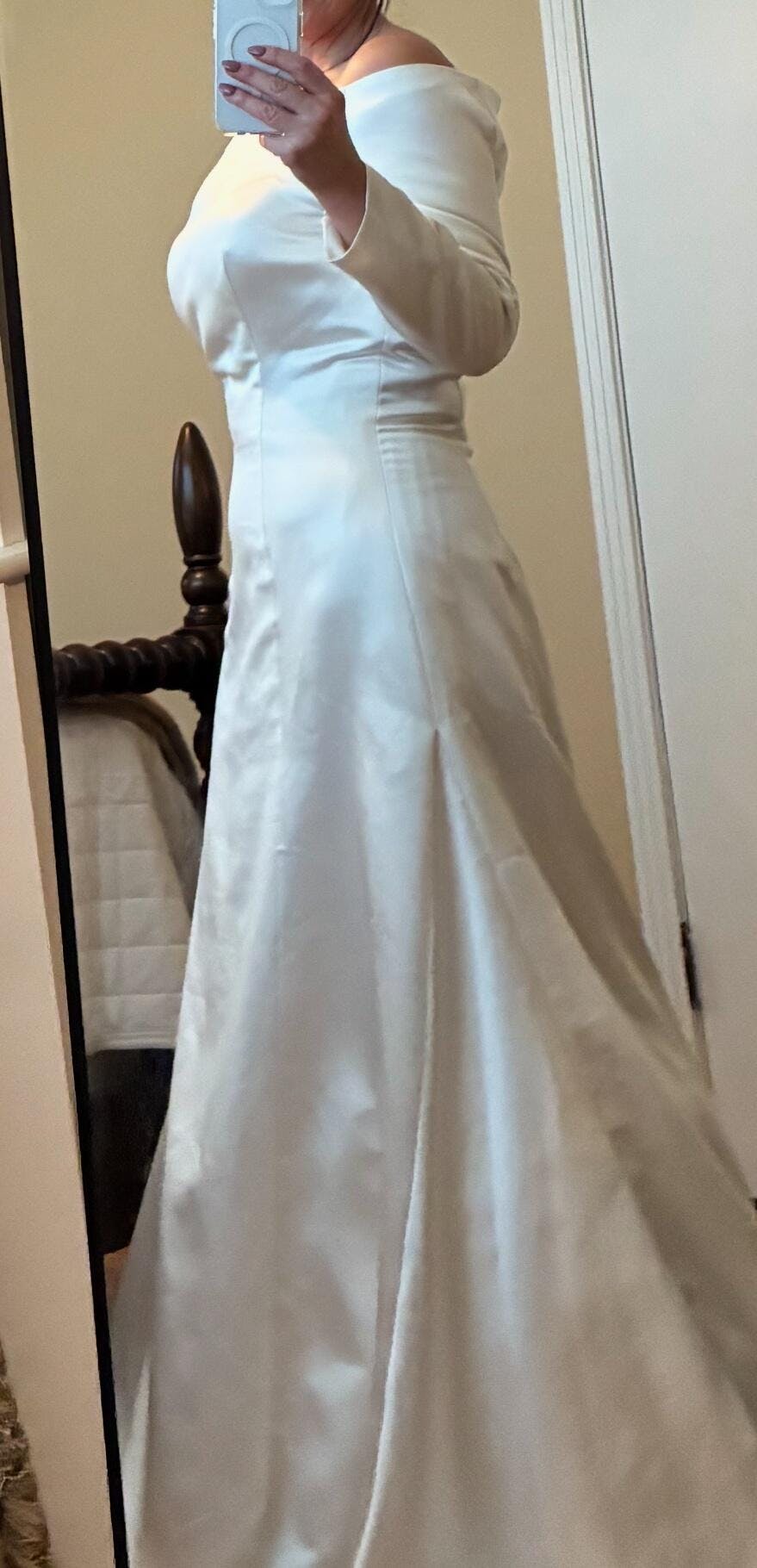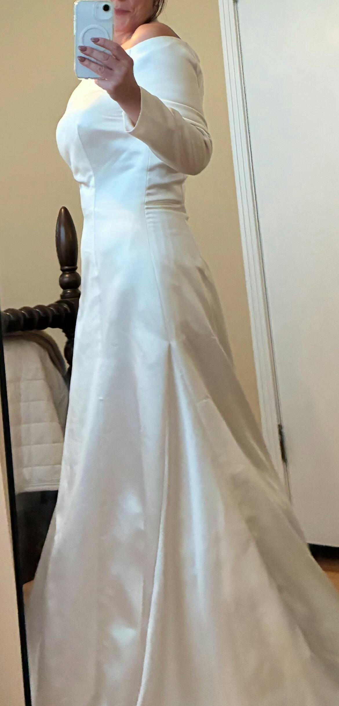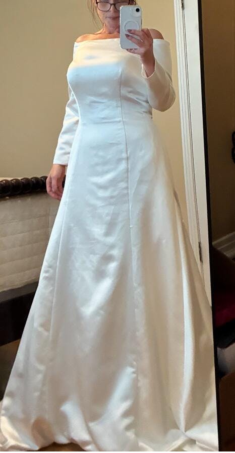 The Ellie simple satin wedding dress is a stunning combination of elegance, grace, and majesty. Radiating a regal air, this fit-and-flare wedding dress offers sophistication through demure simplicity. Unadorned from the chic bateau neckline to the end of the dramatic long train, this long-sleeve wedding dress is a modern bride's dream come true.